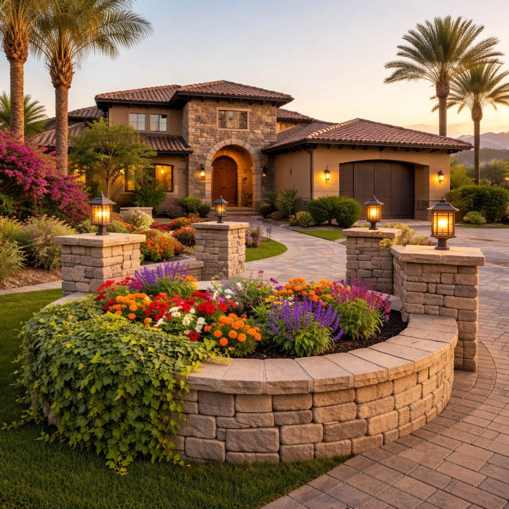 Beautifully designed retaining wall in a Phoenix landscape with desert plants